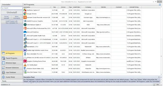 يخول لك برنامج Revo Uninstaller Pro طرق بسيطة وسهلة في الاستعمال ،تقوم تعمل بشكل فعال وقوي لإلغاء تثبيت البرامج انطلاقا من تتبع خطوات أي برنامج منذ تثبيته على جهازك. تستطيع أن تحذف برنامجا معينا بشكل نهائي دون أن تخلف له آثارا برصدك جميع التغييرات التي طرأت على النظام عند تثبيت ذلك البرنامج، وبعد ذلك تستخدم تلك المعلومات لإلغاء تثبيته بنقرة زر واحدة بك بساطة وسهولة . كما أنه حتى وإن لم تتبعت تثبيت برنامج ما ، تستطيع أن تلغي تثبيته عبر سجل التثبيت . الأمر الذي يمكن أن يقع عند استخدام سجلات قاعدة بيانات السجلات. وقد ابتكرت الشركة المطورة للبرنامج هذه السجلات التي تستطيع أن تستخدمها في إلغاء البرامج الخاصة بك بضغطة زر واحدة كما لو أنك قد أنشأت السجل بنفسك، وتستطيع الحصول على أفضل النتائج لإلغاء التثبيت والخبرة.